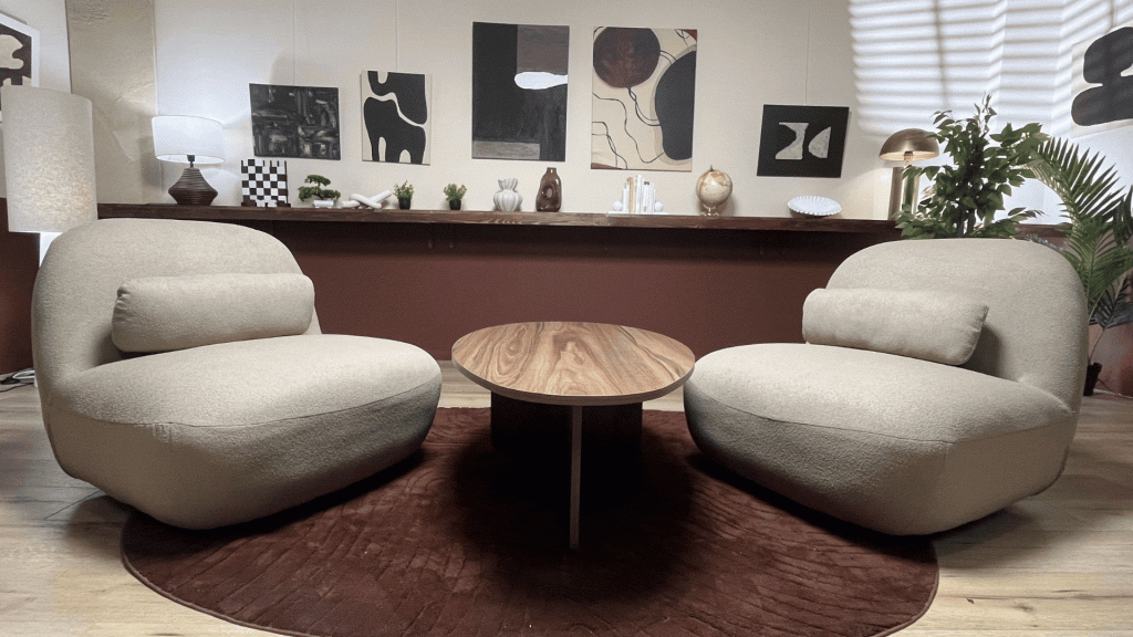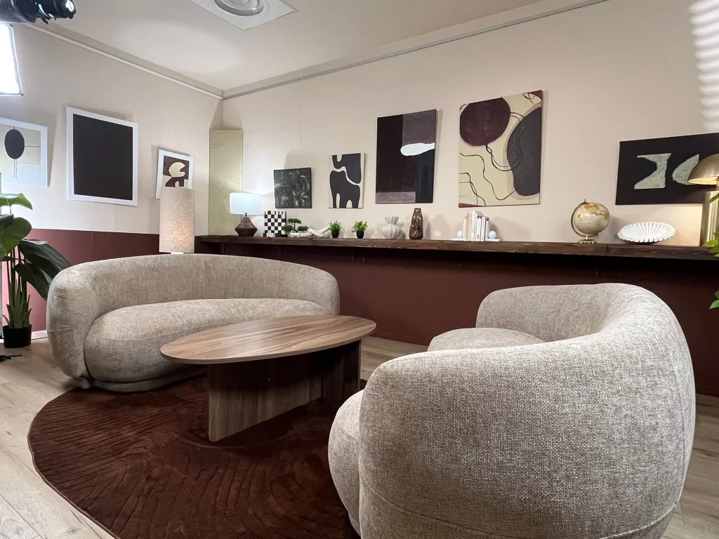 Fauteuils, canapé et petites tables basses pour une ambiance chaleureuse et conviviale, idéale pour des conversations informelles ou des interviews détendues.