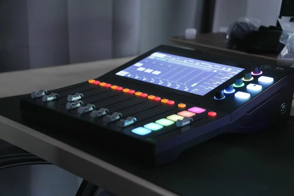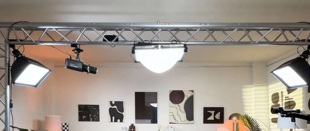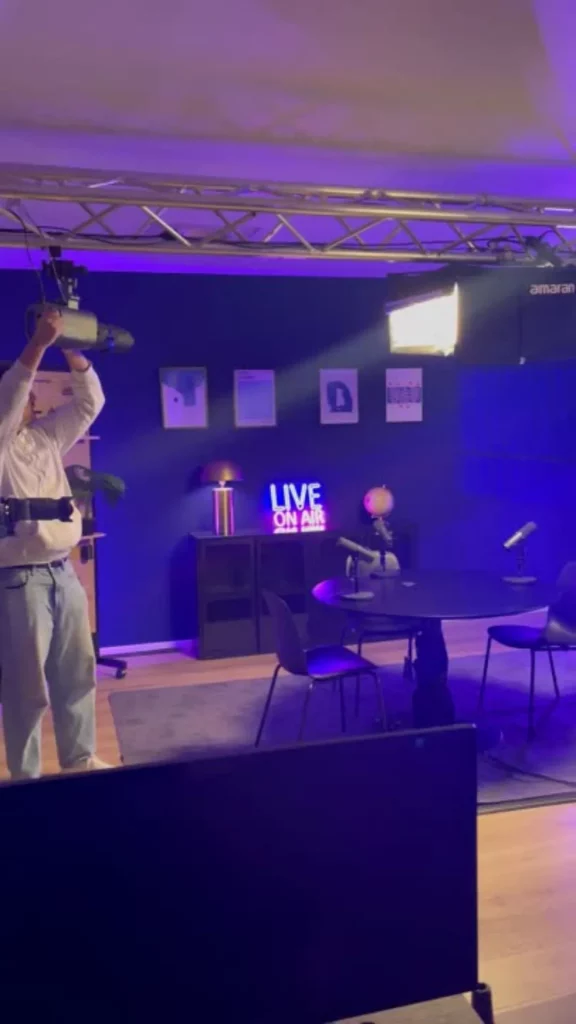 Dans notre studio, chaque enregistrement peut bénéficier d’un look unique, grâce à notre pont de lumière et à nos différentes lampes et projecteurs. Vous pouvez jouer avec l’intensité, la couleur et la disposition des lumières pour créer l’ambiance souhaitée, qu’elle soit chaleureuse, dynamique ou professionnelle.